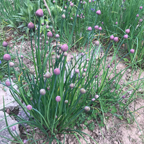 Pictured above are garden-grown tomato plants, chives, mint, and pumpkin.